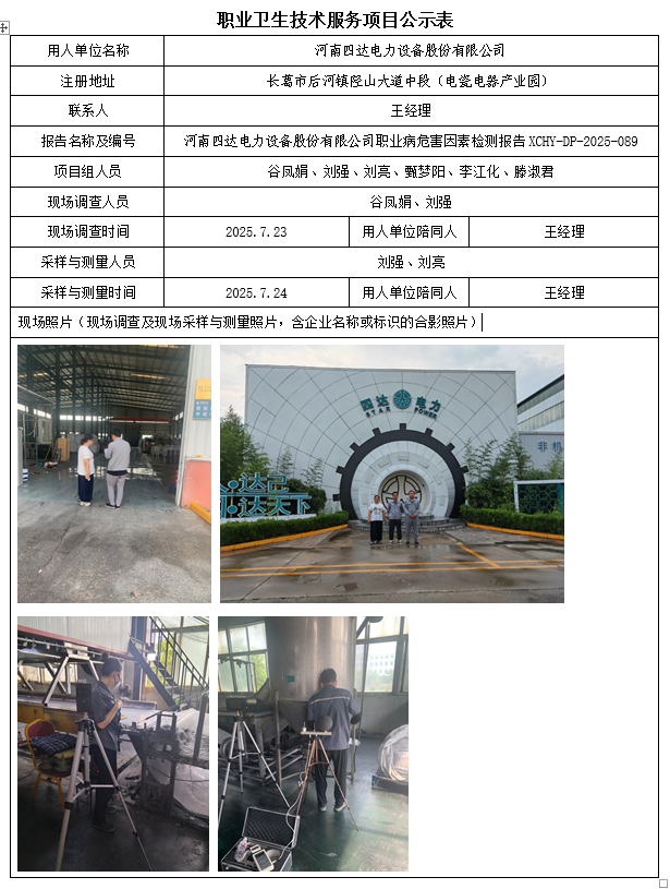 河南四达电力设备股份有限公司2025年度职业病危害因素检测