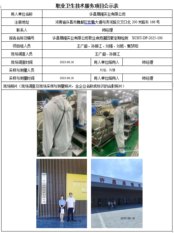 许昌晟隆实业有限公司2025年度职业病危害因素定期检测