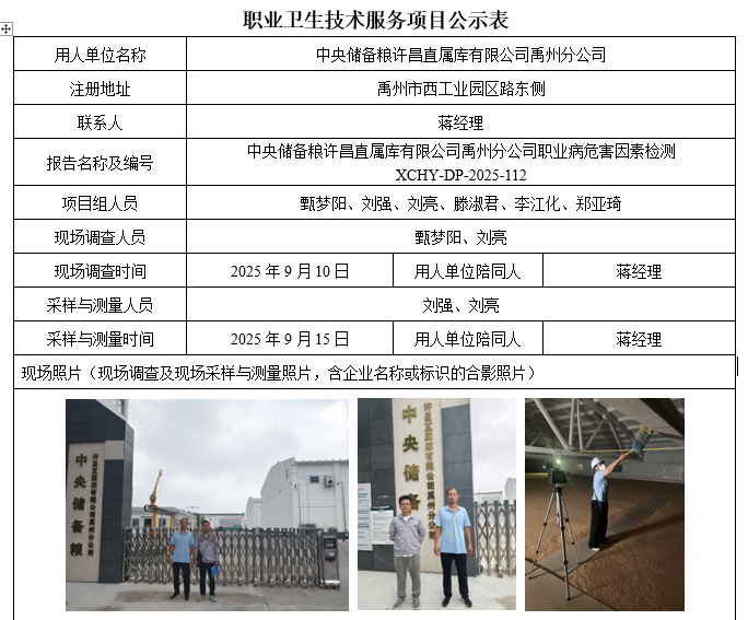 中央储备粮许昌直属库有限公司禹州分公司2025年度职业病危害因素检测