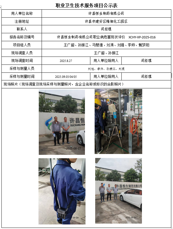 许昌恒生制药有限公司2025年度职业病危害现状评价